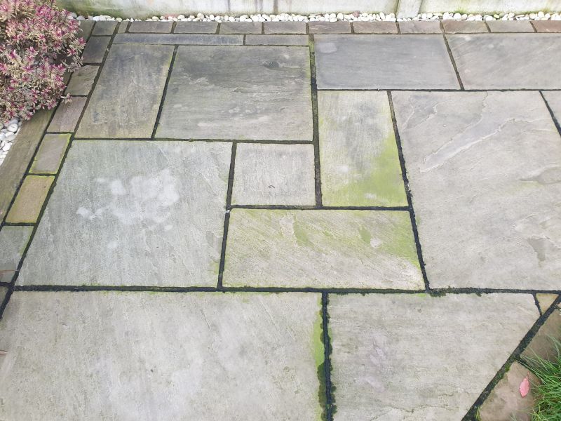 Indian sandstone before having a soft wash treatment applied in Ilkeston